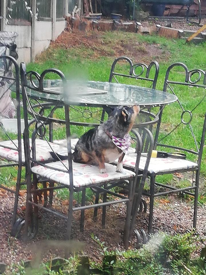 Mummy let us out to go potty ....... But its raining so im waiting under the garden table until it stops